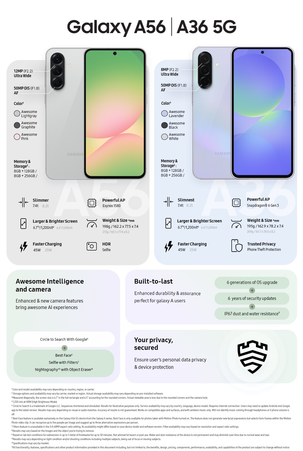 The new Galaxy A series is available in a range of colors.Galaxy A56 5G is available in Awesome Lightgray, Awesome Graphite, and Awesome Pink. Galaxy A36 5G is available in Awesome Lavender, Awesome Black and Awesome White.